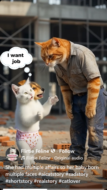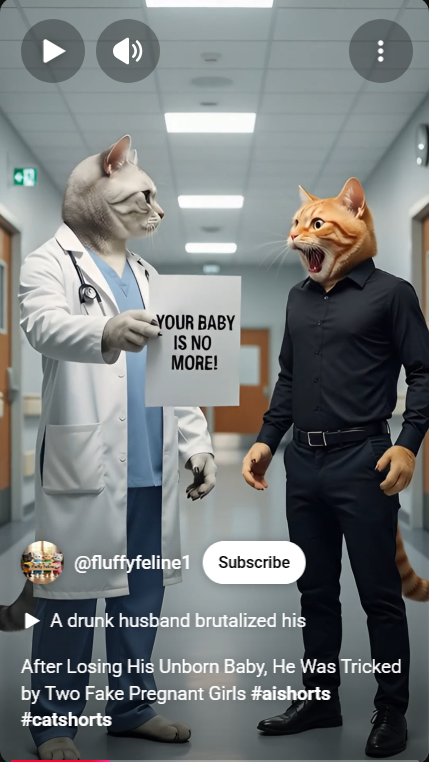 So there one of the more appealing things about the AI cat videos is that there are “trends” — much like so many Lifetime and Hallmark movies feel like the same scripts rehashed endlessly with different actors and minimal changes, the same scenarios will repeat again and again with different cats and slight tweaks. For example, there are a number of videos in which a perpetually-on-the-phone mama cat cooks, burns, or otherwise injures her child via neglect; part of the fun of these is seeing the various dishes she’s cooking and the way they come to fruition. (My favorite involves a mama cat pouring a bunch of items, including fish and whole shelled eggs, into a vat, only for that vat to be placed in an oven and a pizza to be ultimately retrieved.) Also, sometimes the parents commit suicide. Sometimes the cops are called. Sometimes the child doesn’t end up hurt via neglect at all — sometimes everybody escapes the meal unscathed and even does a little dance at the end. The various reveals are part of the appeal.